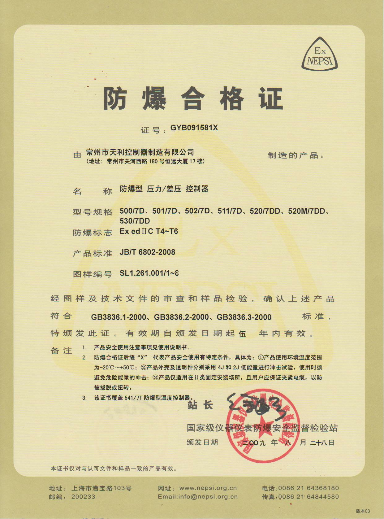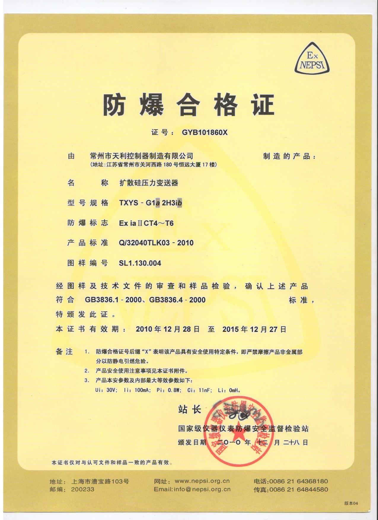 天利控制器天祥牌防爆壓力控制器各類資質(zhì)證書: