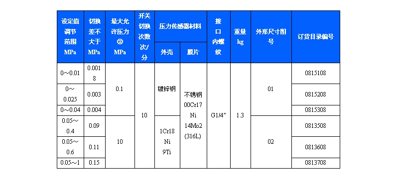 501/7DZ雙觸點壓力控制器采用膜片式的傳感器,可用于中性氣體、液體介質,部分規(guī)格可用于腐蝕性介質。501/7DZ雙觸點壓力控制器設定值可調,調節(jié)范圍0~1MPa。
